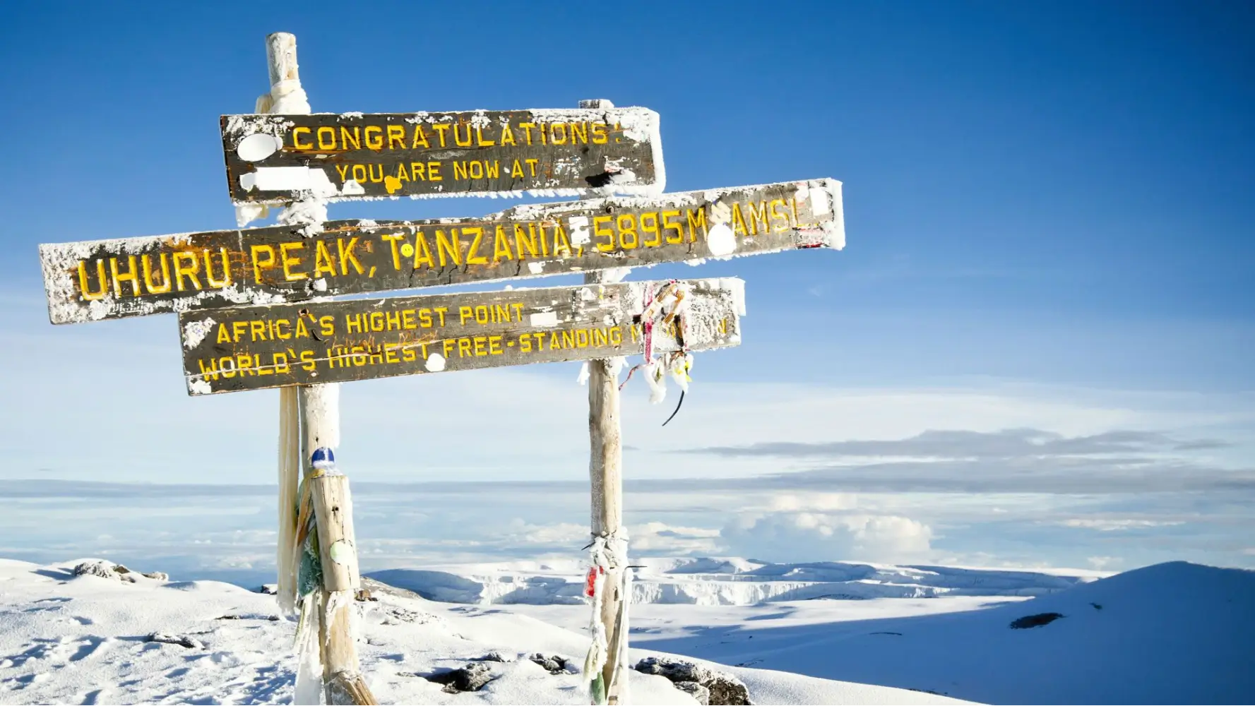 Uhuru Peak stands at 5,895 meters, offering climbers the extraordinary achievement of standing on the “Roof of Africa.” Reaching the summit at sunrise reveals sweeping views above the clouds and an overwhelming sense of accomplishment.